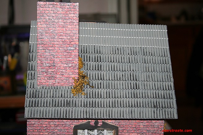 So, working on that. A few changes - put some weeds on the front , in the windowboxes, and next to the chimney on the side roof. Finished that side and started seeing how some black paint looks. Will have to add more, but getting there... * NOTE: Further along on the roof. Oh, what a project! ha!